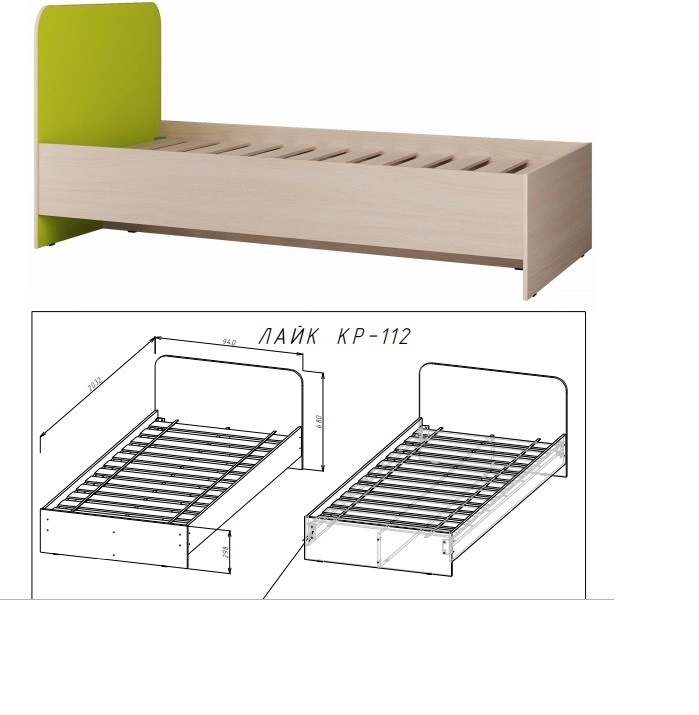- Головной щиток кровати, облицованный кромочным материалом толщиной 2мм, выполнен с точки зрения безопасности в процессе эксплуатации детьми за счёт своих скруглённых углов.