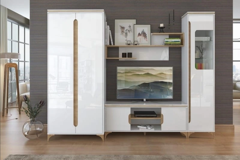 Особенности тумбы: Петли четырехшарнирные с доводчиками плавного закрывания. Опоры пластиковые не регулируемые. Корпус модульной системы изготовлен из 16 мм ламинированой древесностружечной плиты «Дуб Небраска» и 16 мм ламинированой древесностружечной плиты «Белая». Торцевые поверхности корпуса закромлены кромками ABS и меламин. Видимые поверхности корпуса обработаны на лаконаливной линиии и имеют высоглянцевую поверхность. Фасады изготовлены из 16 мм ламинированой древесностружечной плиты «Белая». Торцевые поверхности закромлены кромками ABS. Фасады обработаны на лаконаливной линиии и имеют высоглянцевую поверхность.