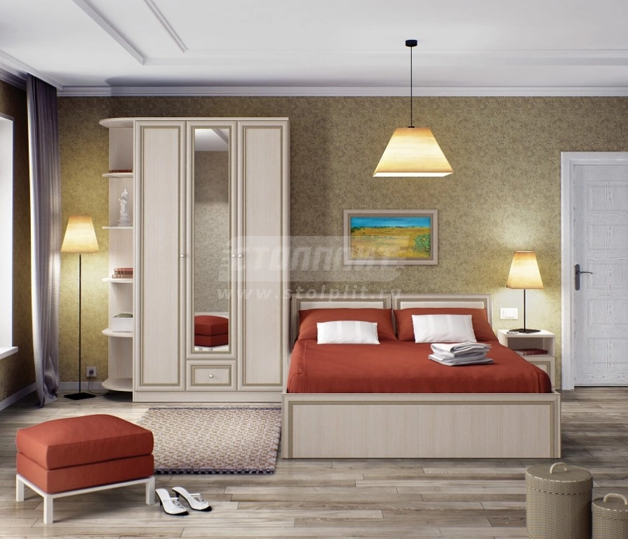 Набор с трехдверным шкафом «Грация Авиньон» подойдет для спальни, выдержанной в спокойных и светлых тонах. В состав комплекта входит трехдверный шкаф с зеркальным фасадом, оборудованный полками и штангой для одежды, а также небольшой выдвижной секцией. В композицию входят удобная двуспальная кровать с выдвижным ящиком, расположенным у изголовья, вместительная прикроватная тумба и стильный угловой стеллаж. Данный комплект включает в себя: