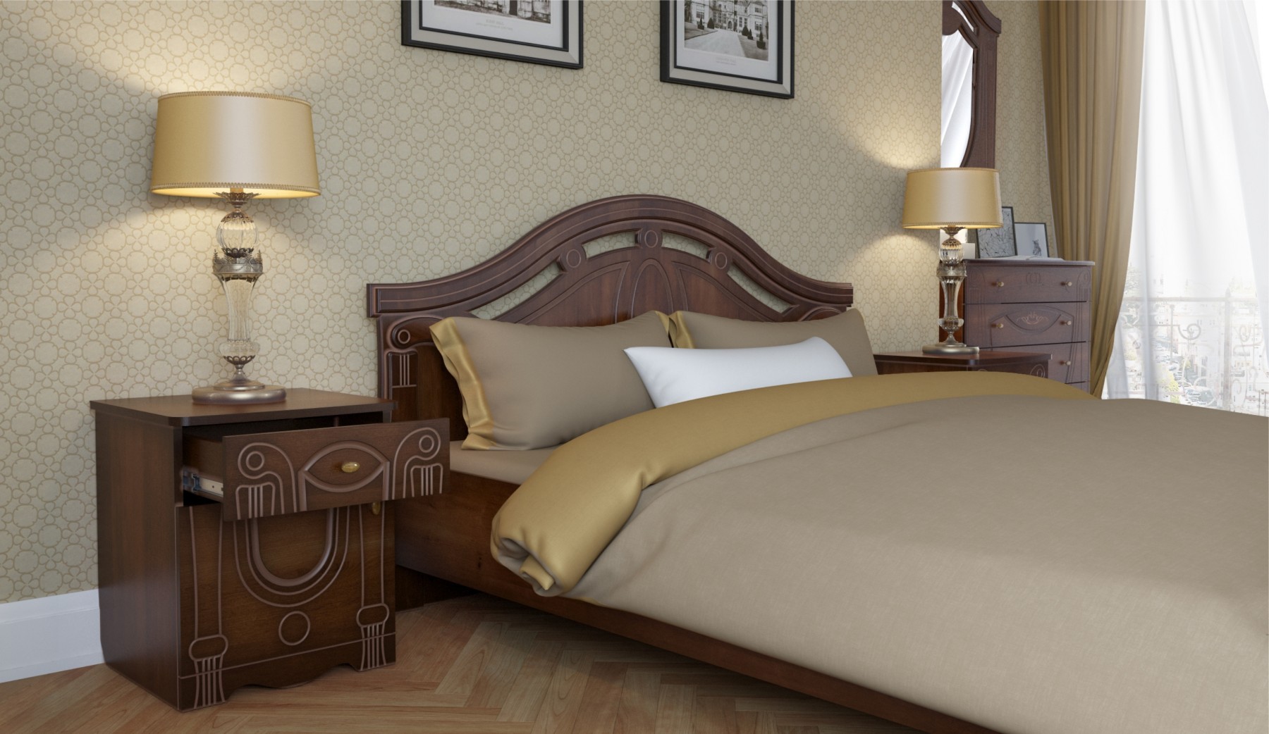 Спальня "Александрина" создаст самый уютный уголок в Вашем доме. Классический дизайн с патинированными фасадами и фасадами цвета орех подчеркнут изысканность интерьера. Основание кровати из стального каркаса обеспечит надежность и удобство на долгие годы. В такой обстановке приятно провести время!