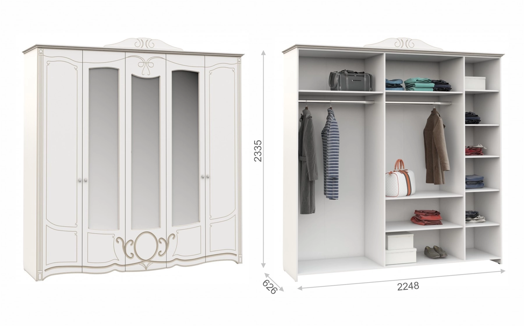 - Шкаф 5-ти Створчатый: Ширина 2248 мм х Глубина 626 мм x Высота 2335 мм